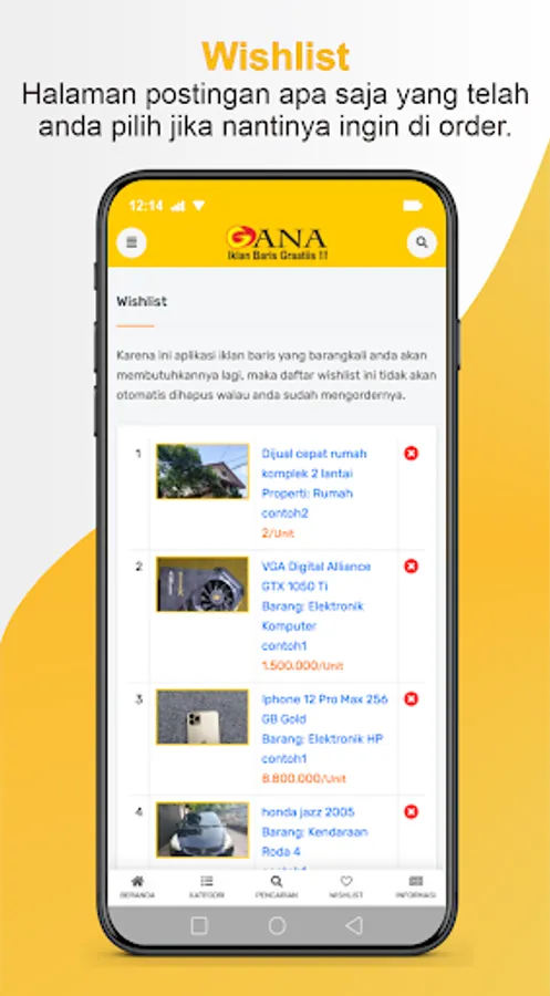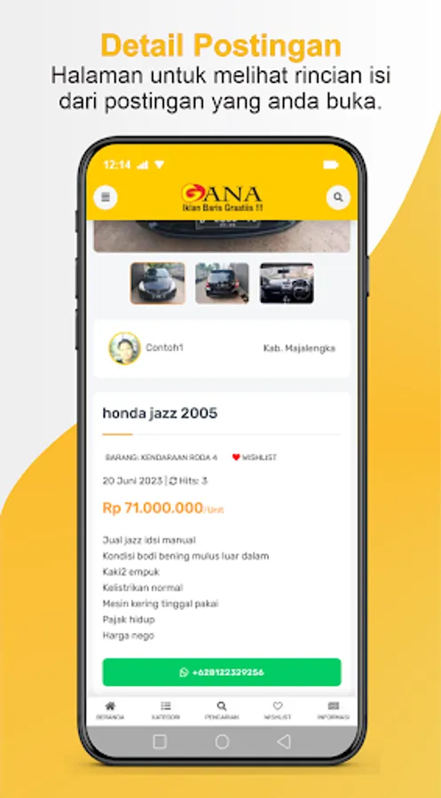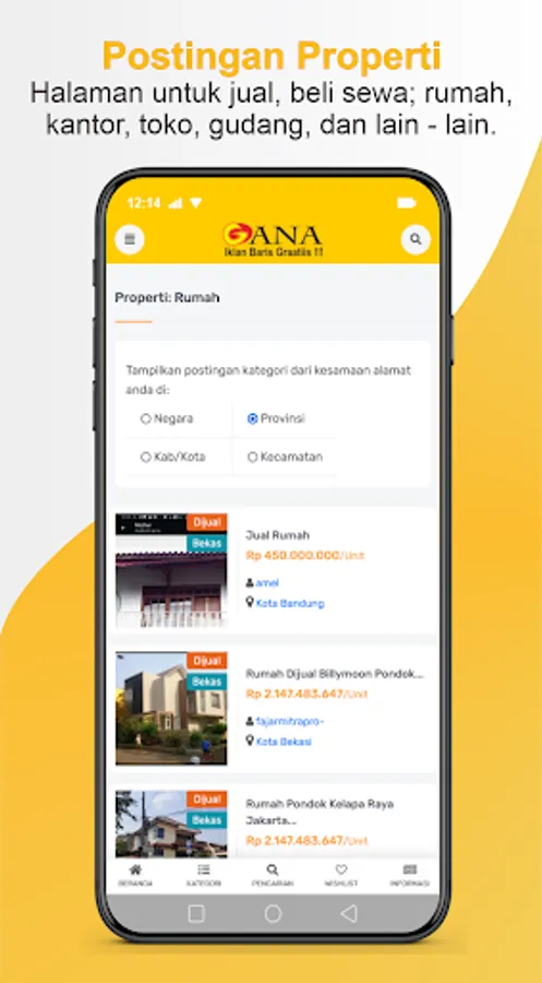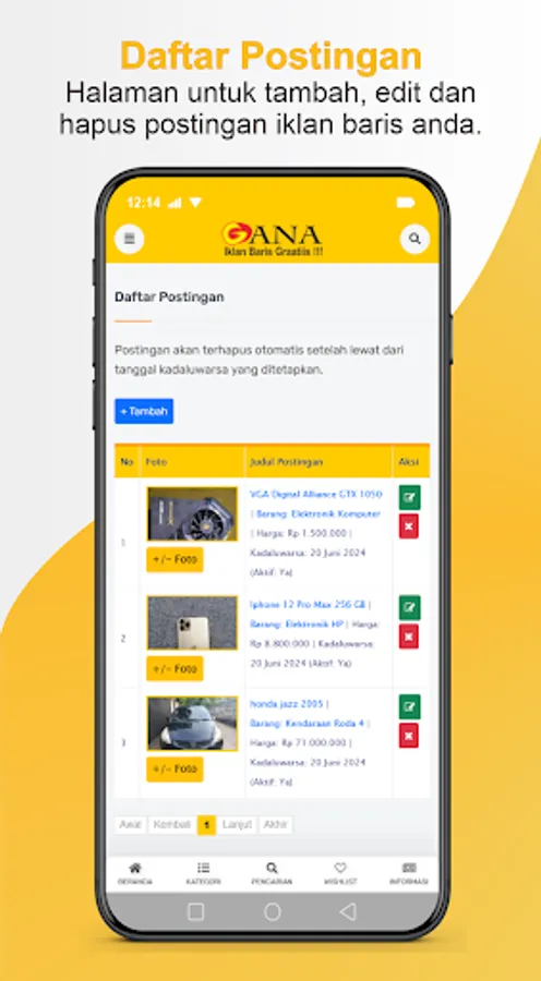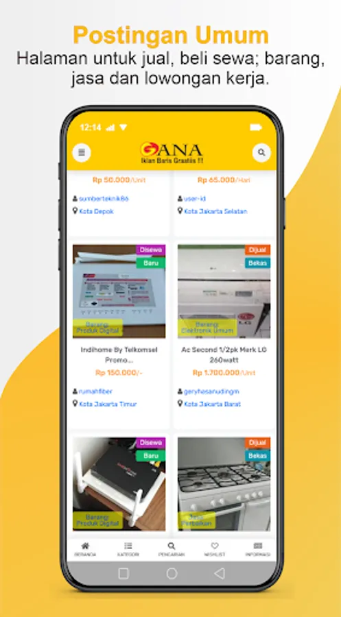 Gana is a classified ad app. Classified advertising is one way of promotion that is usually found in newspapers. This method is a development of advertising promotion that prioritizes appeal with pictures and detailed information in text form, accompanied by a contact person. So this gana application is just posting an ad which later if someone needs a related ad can contact the advertiser from the listed cellphone number. The advantage of classified ads that the Gana application offers compared to other classified ad applications is that they reach the advertiser's district level. So with this, people who need goods, services, job vacancies, property and donated goods can search to the nearest location of the sub-district where they live, then contact advertisers either via WA chat, SMS or telephone, it's as simple as that.