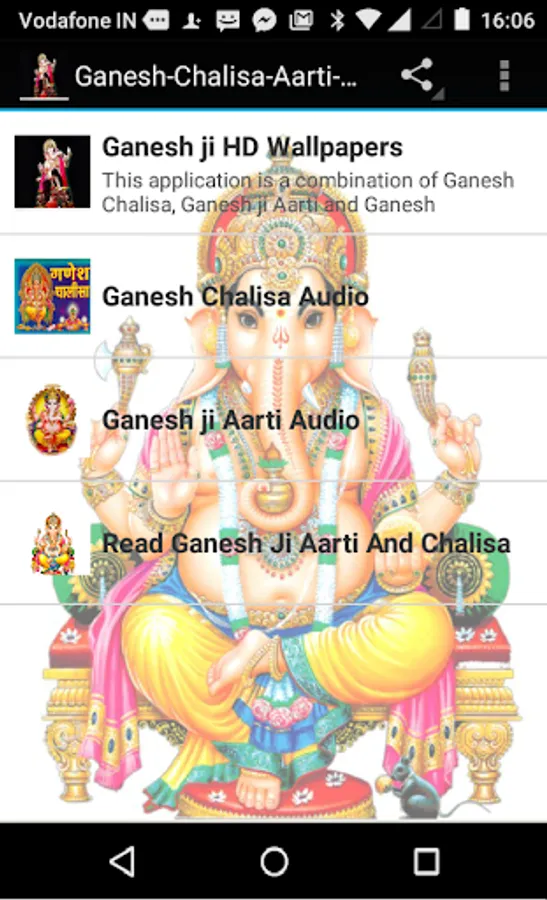 You will be happy to see such a nice collection of Ganesh Wallpapers in one single application with Ganesh Chalisa and also includes Ganesh ki Aarti in Mp3 and in HINDI text.