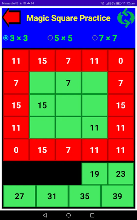 2. Magic Square: This is a knowledge about magic square. Here are three levels of magic squares, three by three (Simple), five by five (medium) and seven by seven (hard). You can test feature and nature of magic square by choosing different starting numbers and different ranges (steps).