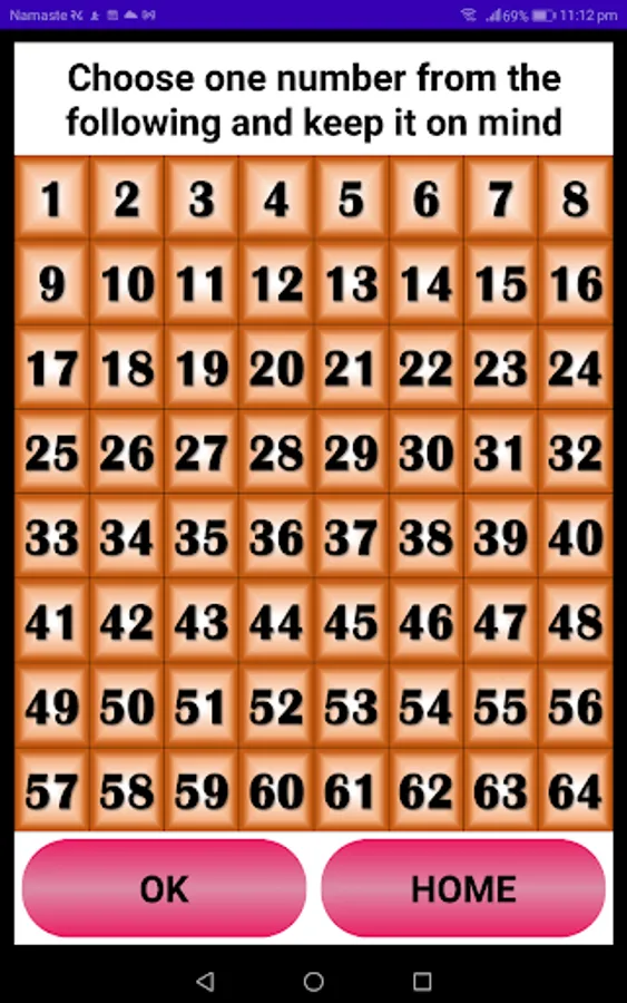 1. I Know Your Number: You can say your friend to choose a number below 65 and keep in mind. Then ask him/her to say if that number is present or not on next six screens. Now you can say his/her number. You can use this game to study the patterns of number collections and puzzle your friend.