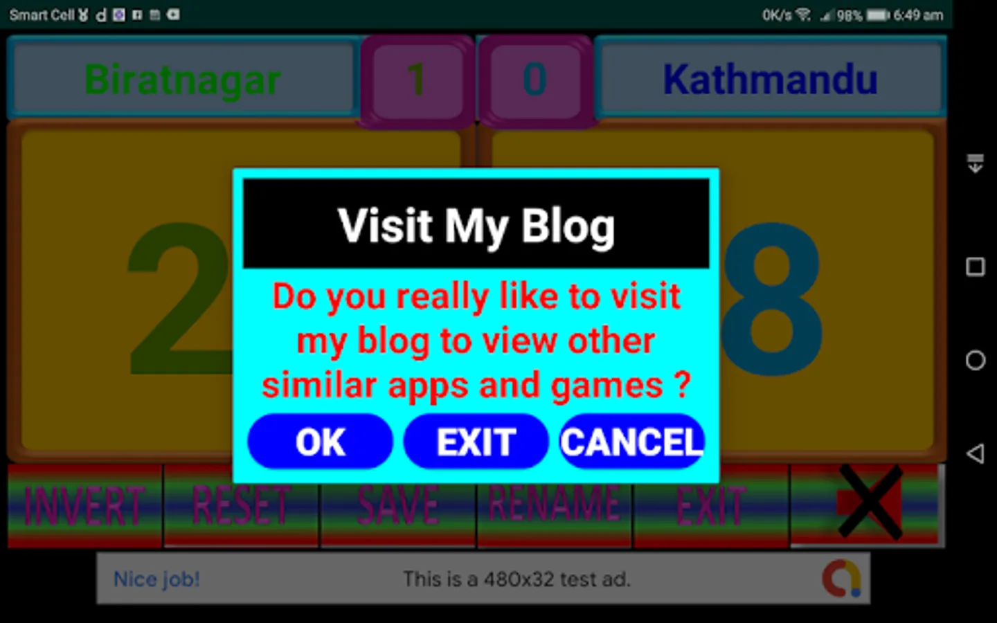 Standard, useful and attractive soft Score Board to count points of volleyball and tennis. First of all you have to click RENAME button which will display a popup for teams name, game over score and best of. Then only needed thing is to click the score area to increase the score. If any score is needed to decrease, you must long click that score area to decrease the score. The invert button will exchange the teams from left to right and from right to left. Reset button will reset all score and game to zero. After the completion of the game, you can save it into pdf format in your device. Each score is announced by the standard English voice in increase of score. You can mute the voice.