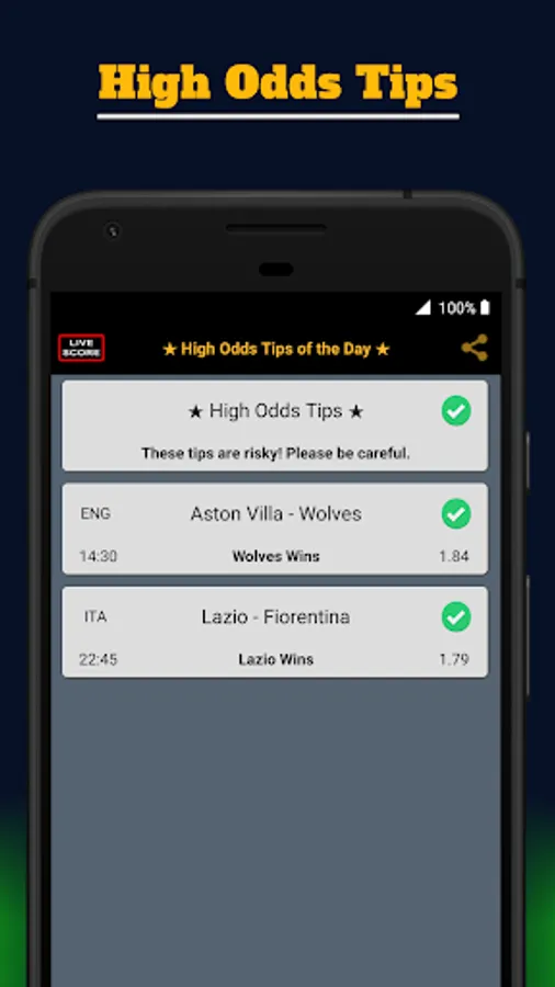 - Livescores to track and follow your sports predictions