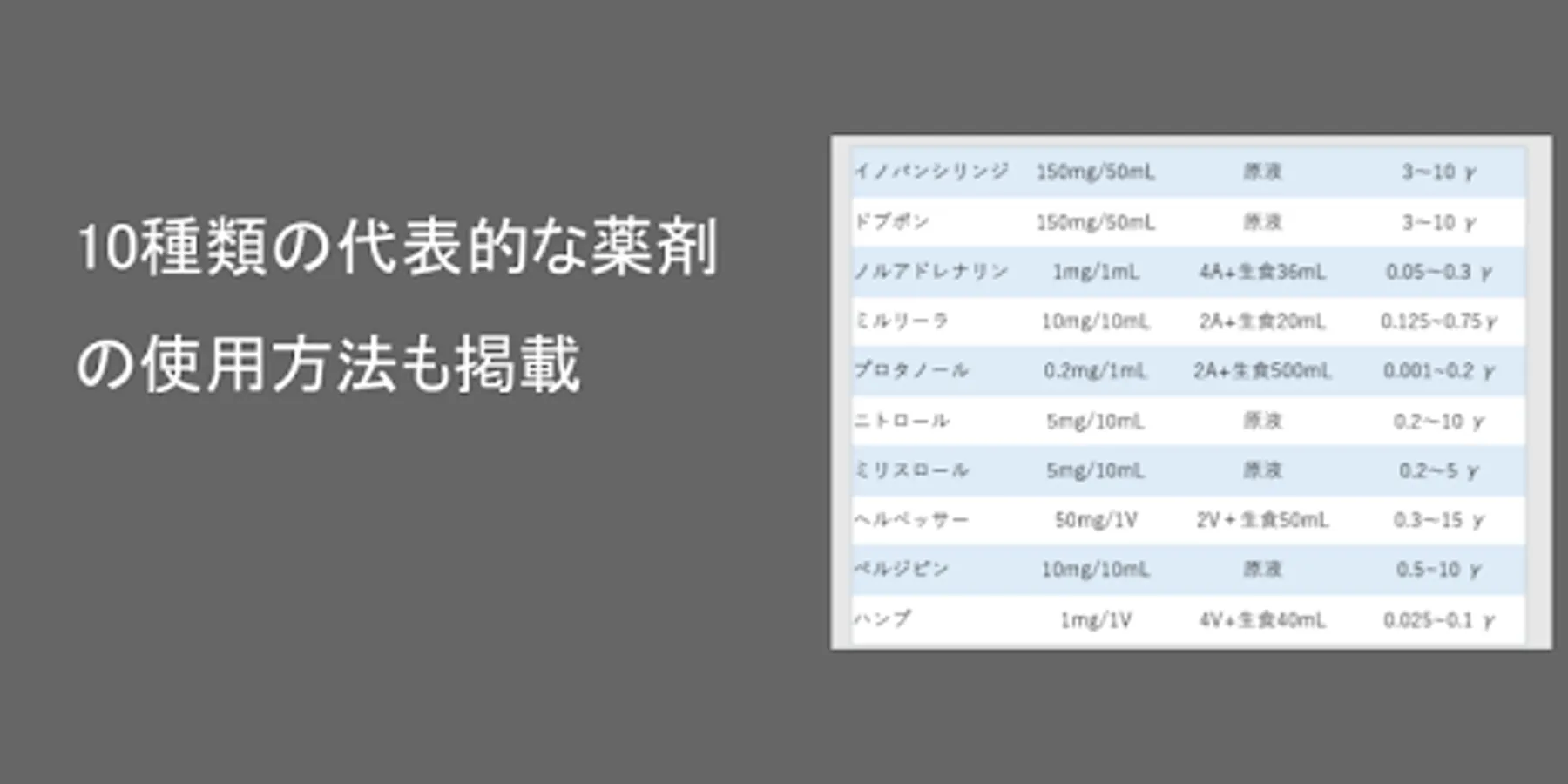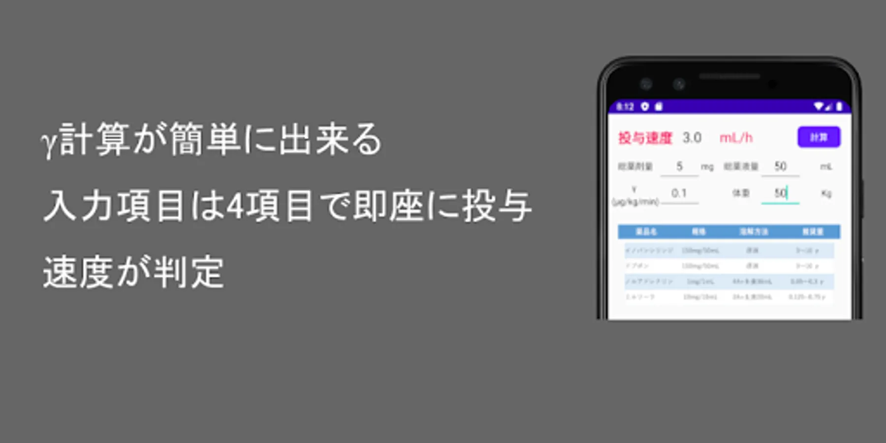Γ (μg / kg / min) calculation, which is often used in clinical settings. The drip rate can be calculated quickly from the target γ. Examples of frequently used drugs are also posted.