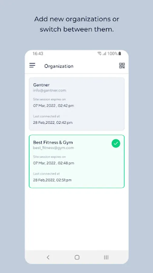 • Connect to organization: You can connect to an organization by scanning the QR code at the organization/site which uses Gantner BLE Type 1 lockers.