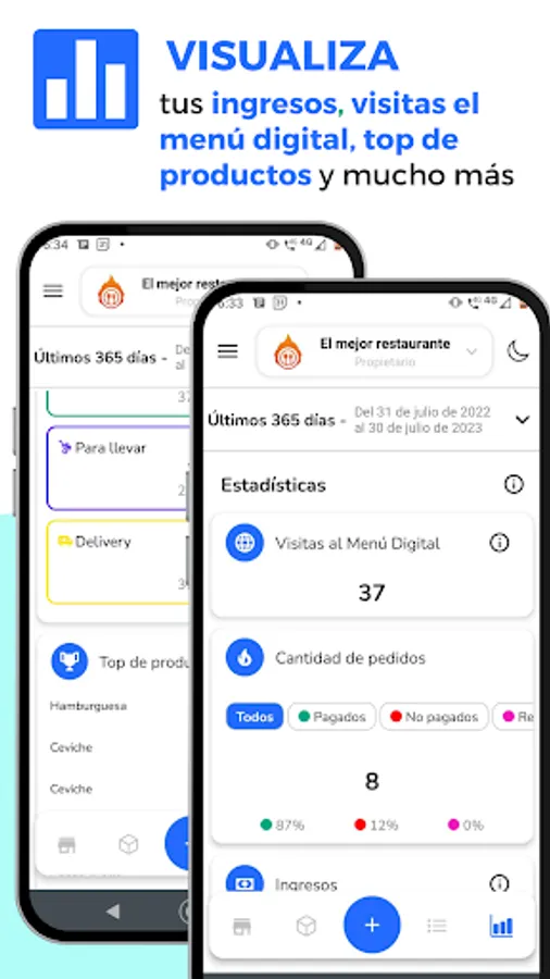 📊Statistics: View the revenue, the number of orders (classified by payment status and type of service), the top of the most ordered products and the number of visits to your digital menu today, yesterday, the last 7 days, 14 days, 30 days, 180 days and 365 days