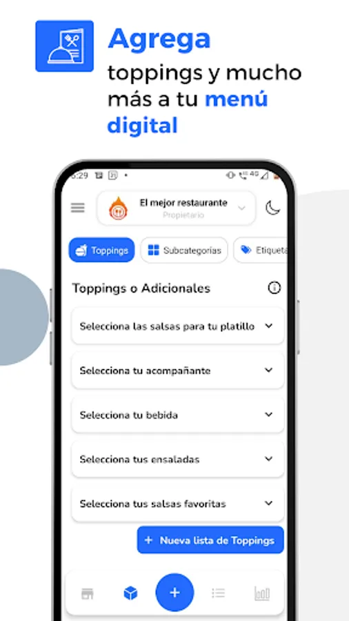 🍔Toppings: Create toppings or additional lists and associate them with your products, so you can provide a better shopping experience to all your customers. For example, you can create a list of toppings called "Select your favorite sauces" and that contains: Mayonnaise, Ketchup, Mustard, etc.