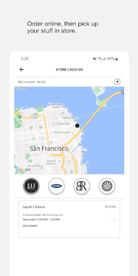 Find a store near you: Use the app to find a nearby Gap store so you can shop in-person. You can also get your items quicker by placing a pick-up order on the app. Select your size and color to see which nearby Gap store has the item you want.