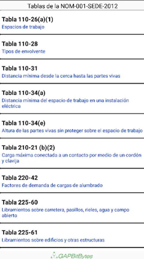 The following Application is a compilation of Tables of electricity topics, published in the Official Mexican STANDARD NOM-001-SEDE-2012 Electrical Installations (use) and the app only recreates them for quick consultation in the field of work, the application of the tables is the sole and total responsibility of the user.