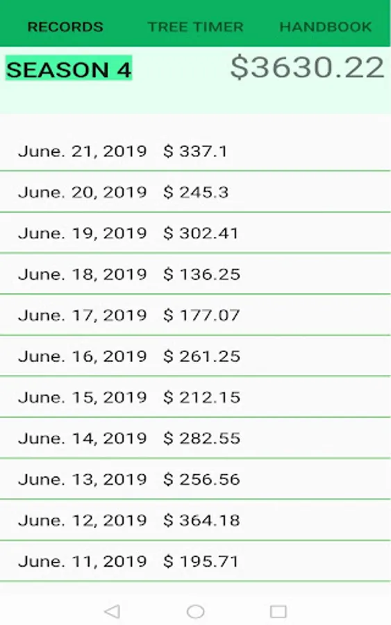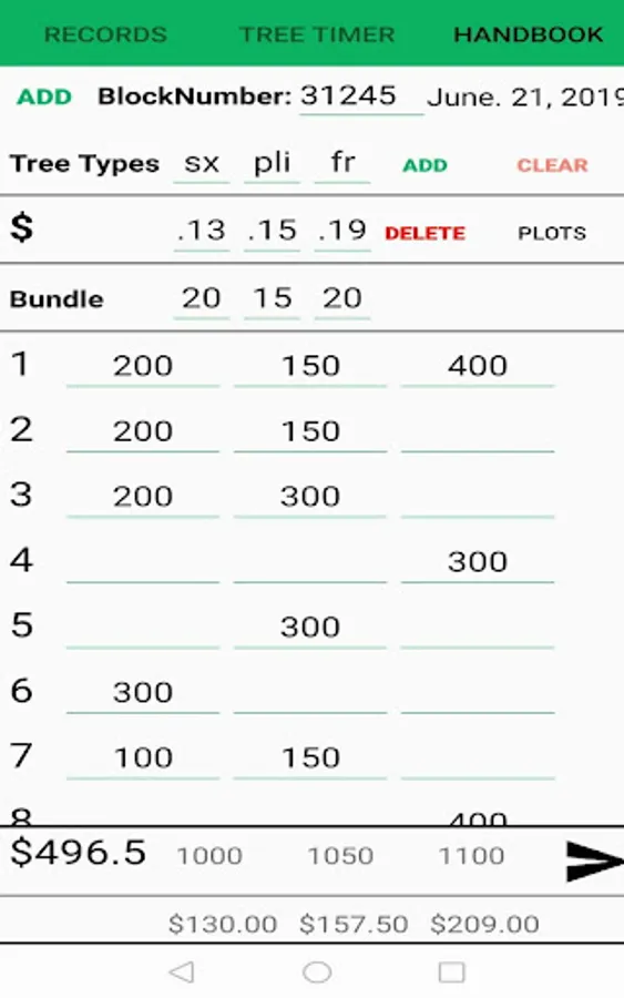 Handbook: Say no more to losing your handbook, getting it soaked or pages ripping out! This handbook allows 5 types of tree's to be inserted on up to 3 different blocks! All inputs auto calculate to show you the amount you make along with the amount you made for each type of tree. You won't have any more problems with putting the wrong value in because the app won't let you save until you've inputed the correct value based on your bundle size!