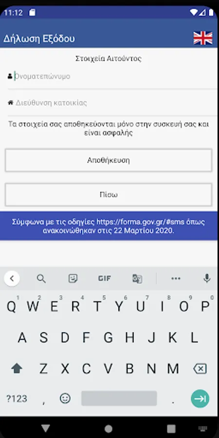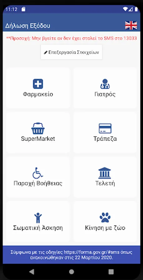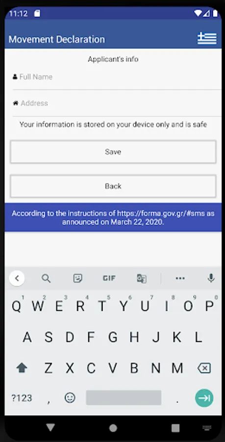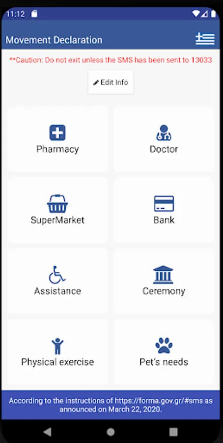 You choose the type of output you want, you enter your data only the first time, which are stored only on your device and then by pressing "Send" you are automatically transferred to the SMS page with the text ready for sending.