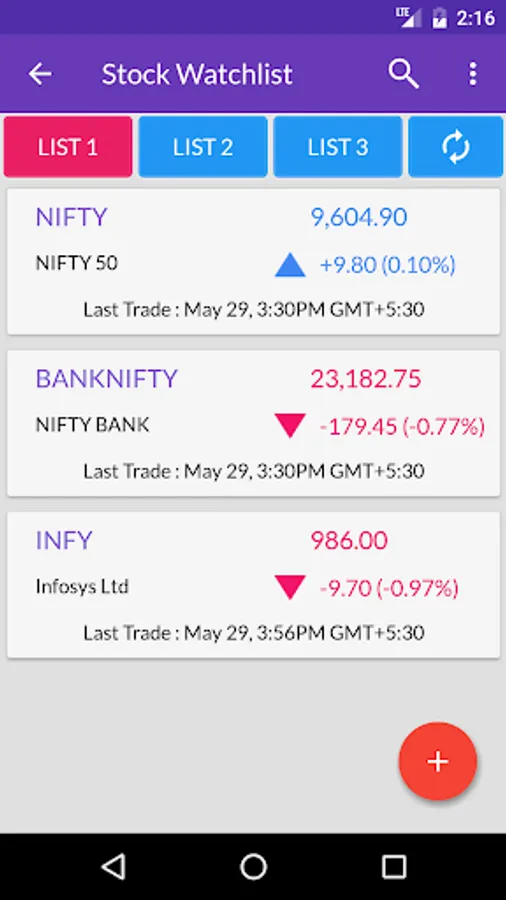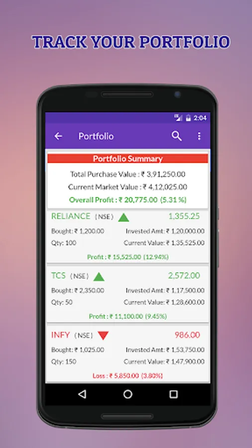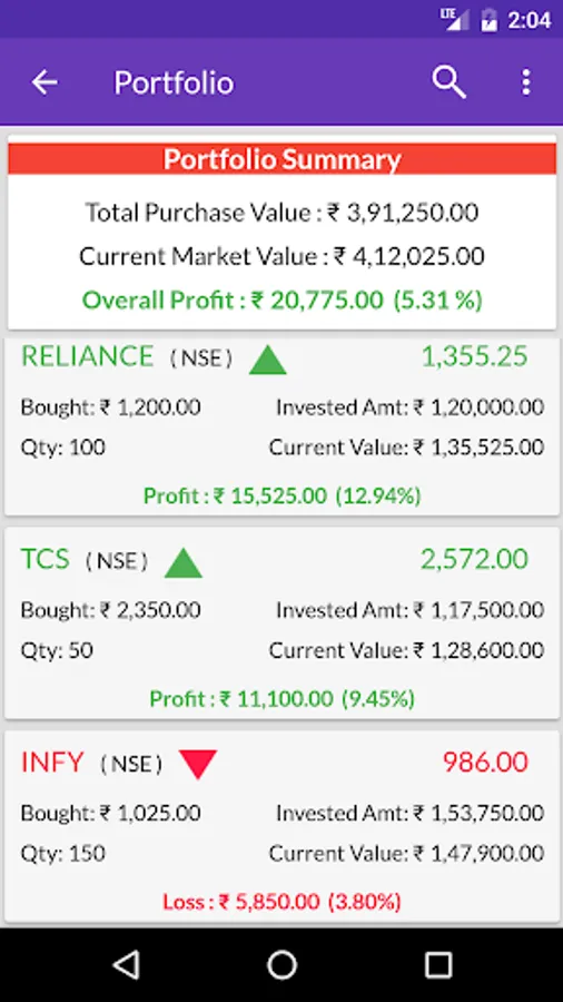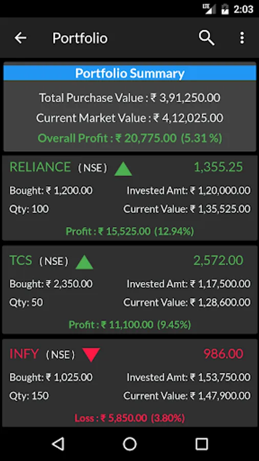 You can add any Indian stock company to the watchlist and get latest stock quotes. You can even build your portfolio by adding all your existing shares and keep track of day to day profit & loss calculation.
