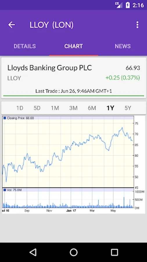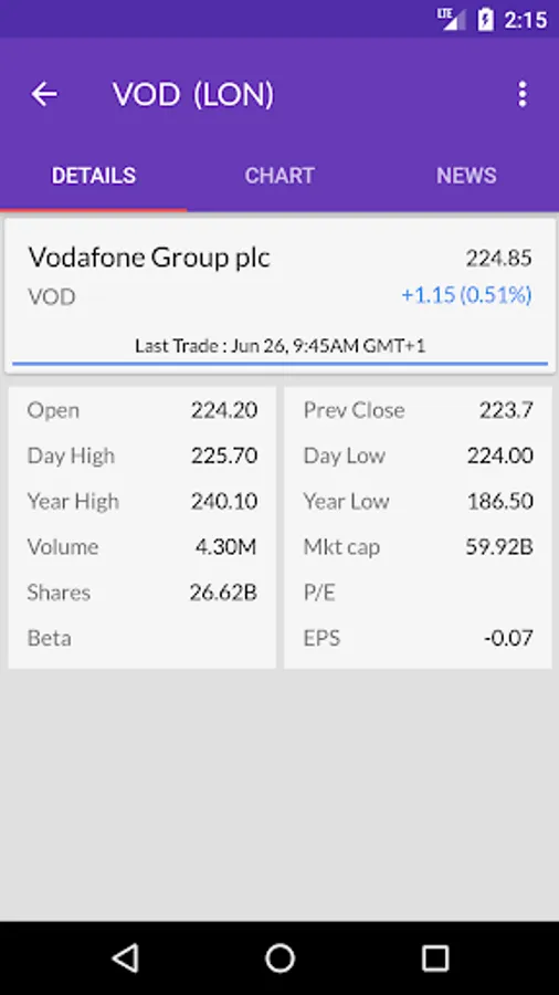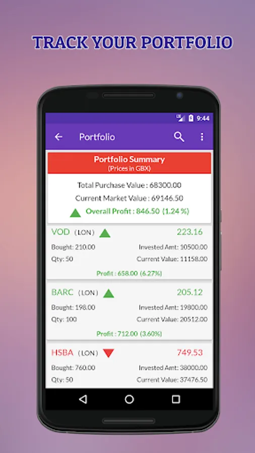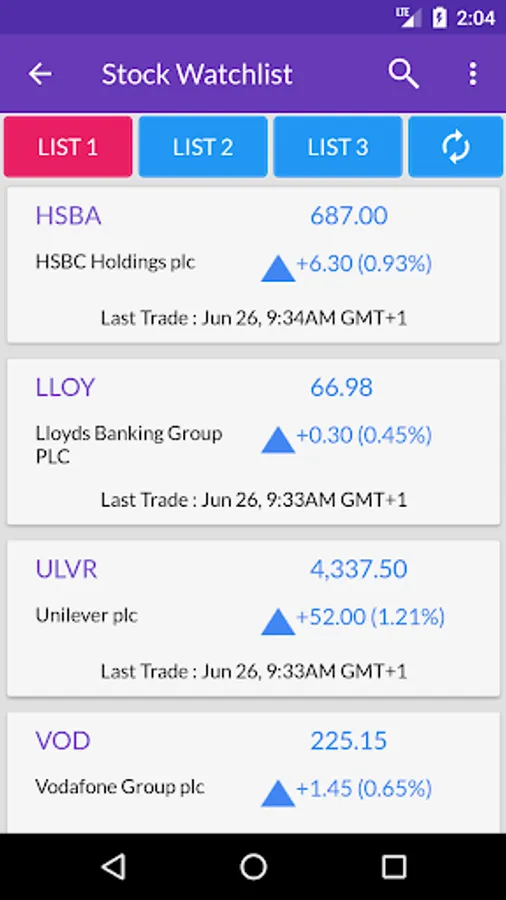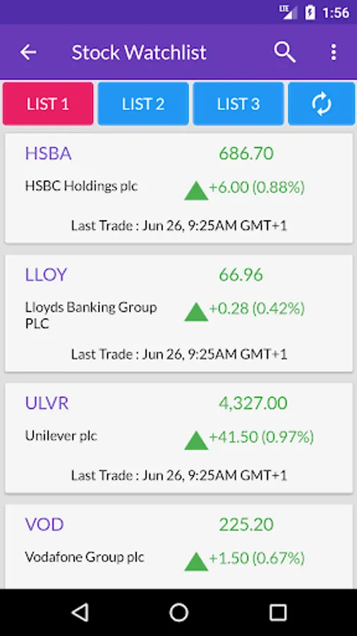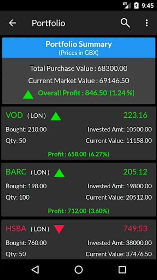 You can add any London stock market listed company to the watchlist and get latest stock tickers. You can even build your portfolio by adding all your existing shares and keep track of day to day profit & loss calculation.