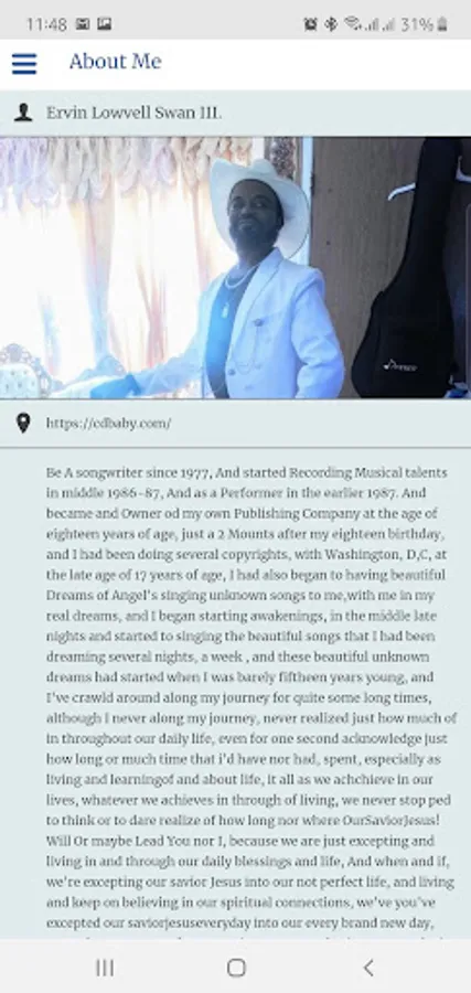 Hello everyone, how are you? I'm Ervin L. Swan III, and I just want to introduce myself, and share some delighted information with you, I been writing spiritual Christian Gospel Praise and worship, for a very long time now, and thought at this part and time in my joyous time, in my life, that this is a good time for me to share with you, some songs that I wrote at the age of 15, and although it has taken me a very long time to even find a music arranger, and although I continue to write songs for myself for a very long time, and so here I am everyone, and I come to the owner of my very own Publishing CO. at the age of eighteen years old, and so I'm very Thankful for our savior Jesus, for His many blessings to you and I, and yes I've finally had these blessings Opportunity to really worked and working very much to sharing my blessings with everyone, my Publishing CO. is Brickell's Publishing Co. B.M.I., since 1977, and all rights and copyrighted since 1977, and so I also am a song Artist and performer, Nondenominational & International Religious Praise and Worship OurSaviorJesus it's taken me a while, and Thankful that I'm still here, yes indeed I am also a Radio Show Host-Producer speaker and make several youtube's Music Videos, and lots of meditation with lots of Praying, and just trying every day to just enjoying a Blessed everyday normal living and seeing life living is a blessings gift and a loan from oursaviorJesus, is all a man could ever really need , and it's so much more that I could say, and so maybe as you and I, Fellowship together, if you will have my presence on your television your cell phone and wherever we can just spend a little time together is all I can ask for, you, and I, just having a little talk with Jesus, and we know that we truly believe in Him, there isn't anything that our savior Jesus, can not Do, jesus Will Open Doors for you, and I, that know other man can See!!!