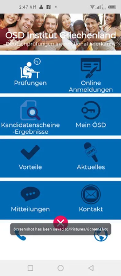 Das Österreichische Sprachdiplom Deutsch (ÖSD) ist ein staatlich anerkanntes Prüfungssystem für Deutsch als Fremd- und Zweitsprache. ÖSD Zertifikate sind als Nachweis von Deutschkenntnissen weltweit anerkannt. Mit der ÖSD Institut Griechenland App können Sie jetzt schnell auf die wichtigsten Informationen zugreifen und alle Funktionen der ÖSD Webseite mobil nutzen. Alles was Sie über die ÖSD Prüfungen wissen wollen, Prüfungstermine, -scheine und -ergebnisse, sowie Vieles mehr liegt jetzt auf Ihrer Hand. Melden Sie Ihre KandidatInnen zu den Prüfungen oder zu einer Probeprüfung an, buchen Sie einen Termin für „Mein ÖSD“, schicken Sie uns eine Nachricht, oder rufen Sie uns per Knopfdruck an!