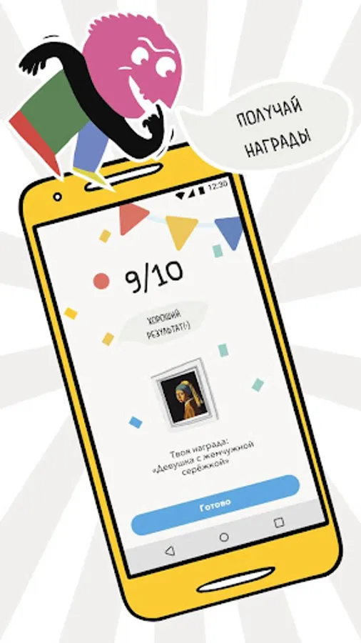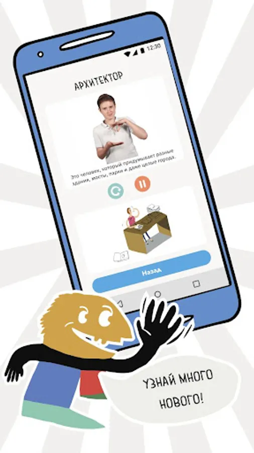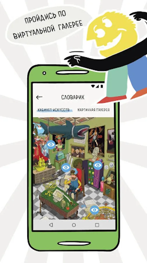The game mechanics of the application makes the process of acquiring knowledge fun for the child, and the intuitive interface allows using the application without the help of adults. Each term is demonstrated through short videos where deaf children teach their peers about the art in sign language. All videos are also supported by interactive illustrations. The appendix uses illustrations by the artist David Boehm from the book How the Museum Works.