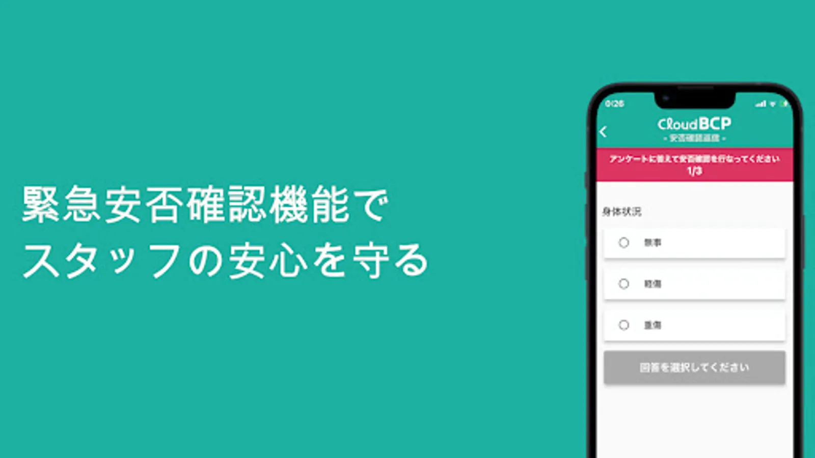 With this application, you can reply to emergency safety confirmation messages sent from the PC version of CloudBCP. In the event of a disaster, you can immediately inform your physical condition, house situation, whether you can go to work, etc.