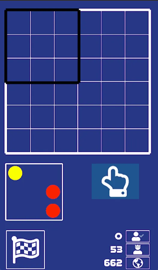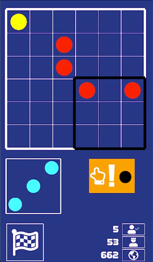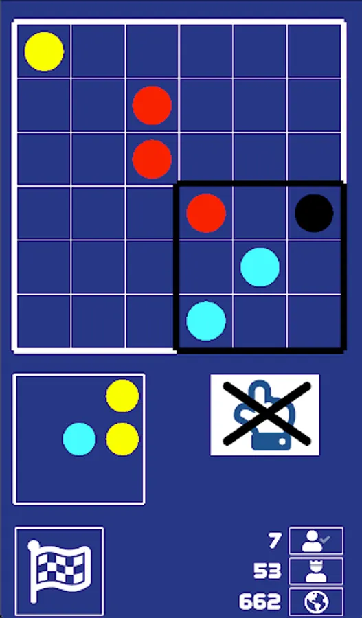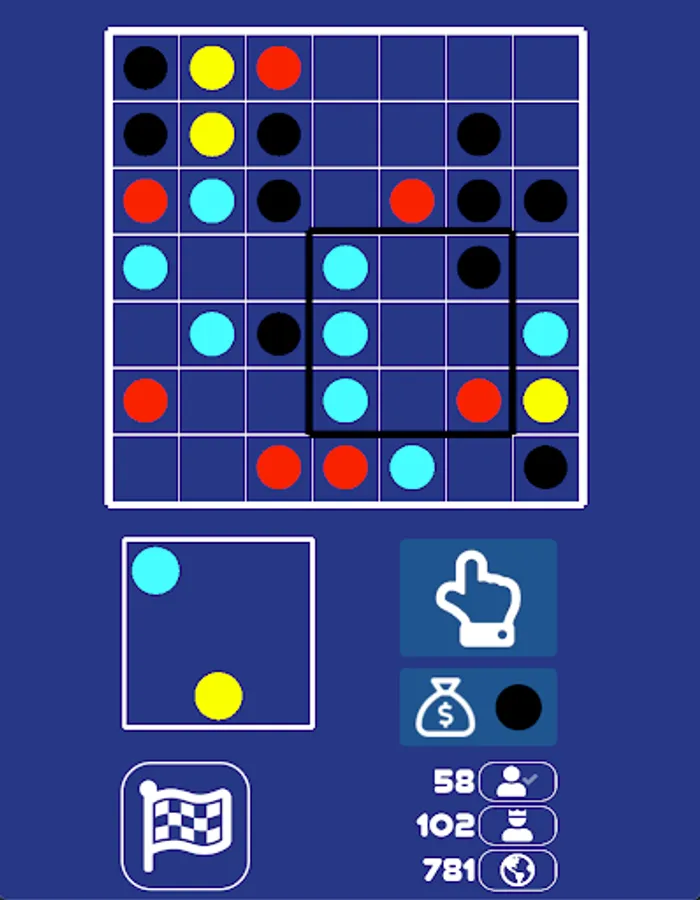 Place the 3×3 group of balls on the board, trying to match as many colours of existing balls as possible. For each matching colour you’ll get 5 points. For every ball placed on an empty space you’ll get 1 point. If you place a ball atop another ball of a different colour a hole will be created, that you could fix by spending points.