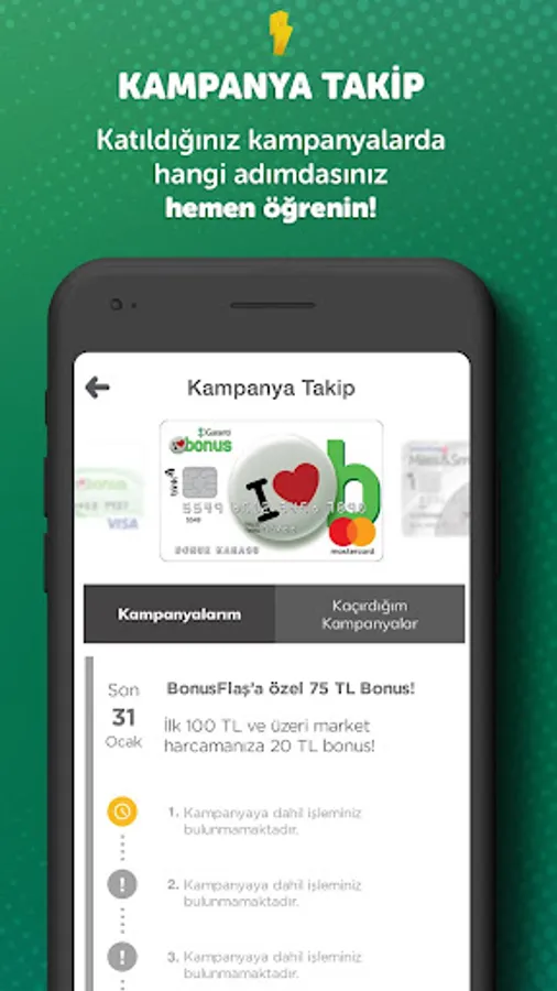 • With BonusFlaş, you can access hundreds of bonus campaigns, miles, MR, installment opportunities and discounts, and participate in campaigns free of charge. Before your shopping, you can view card campaigns in clothing, fuel, market, travel, tourism (hotel and accommodation), food/beverage, technology, accessories and many other sectors from BonusFlaş and win plenty of rewards.