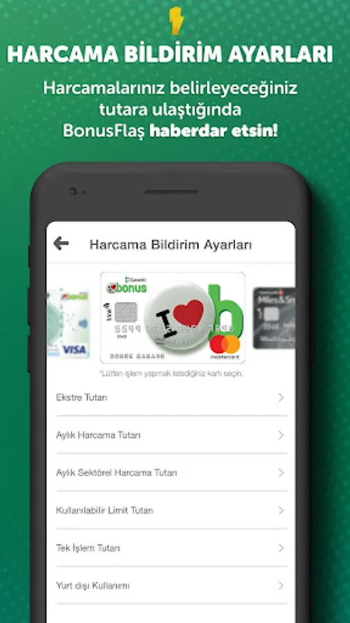 • With Expenditure Control, you can enter the amount for your desired credit card and control and track your expenditures! BonusFlaş will notify you free of charge when your statement and monthly total expenditure reaches the amount you set, and when your available limit falls below the amount you set. You can also set a sector-based amount for your monthly expenses.