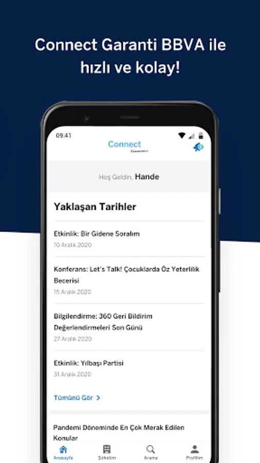 This application is a corporate application developed for employees of Garanti BBVA and its subsidiaries. With Connect Garanti BBVA, employees of Garanti BBVA and its subsidiaries can access organizational structures of group companies, profiles of their colleagues, news and announcements within the company anytime, anywhere. It can track important dates, company and personal reminders.
