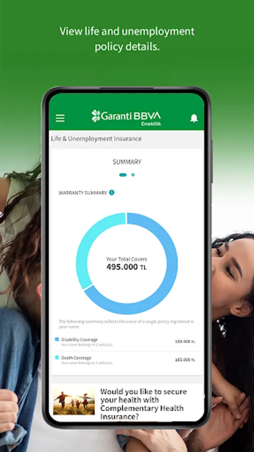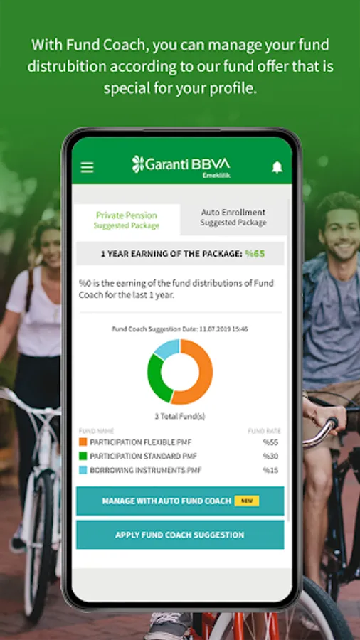 Your private pension, life and unemployment insurance products are always by your side with our Garanti BBVA Pension Mobile! You can easily login via your Garanti BBVA Bank or Garanti BBVA Pension customer information and view the total saving summaries, fund and risk distributions of the contracts you participate in and see all the details regarding your payments at the “Account Activities” tab.