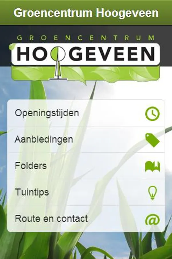 Green Center Hoogeveen, Hoogeveen of the garden center offers a variety of useful information in this app! With this app you are always aware of the offers we have and activities we organize. You will also find this app useful gardening tips and background information on the products in our garden center. This makes better use of your purchases and you have more fun with.