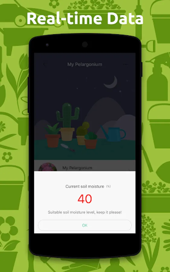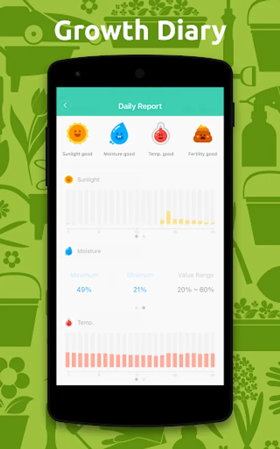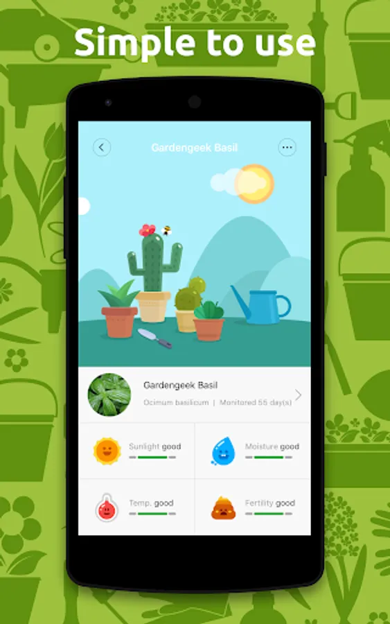 Monitor your plants' moisture, sunlight, fertilizer and temperature on your smartphone by downloading the GreenFingers App and connecting to the GreenFingers device (available at www.gardengeek.com)