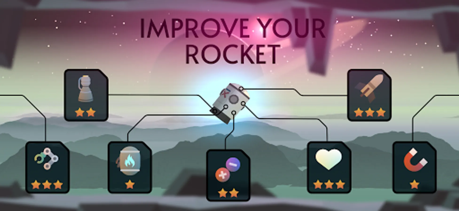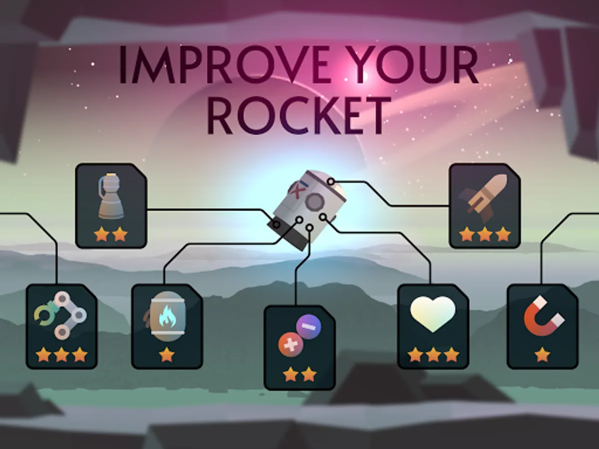Collect coins, get rare components to improve your flop rocket. Upgrade your engine, armor, and fuel tank. Each improvement will allow you to survive longer and more efficiently on this Space Frontier.