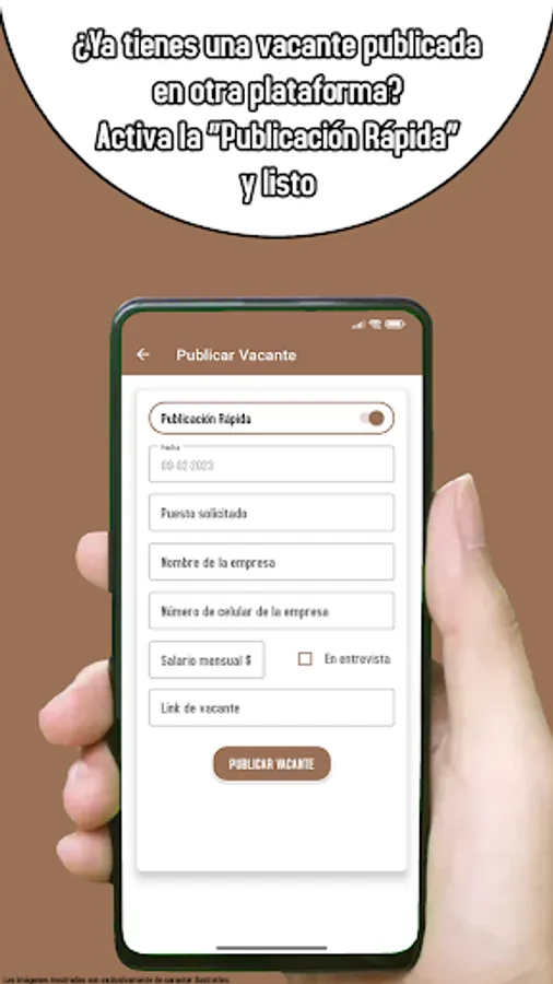 ✅ Activate the "Quick Post". If you have already published your vacancy on another platform (Facebook, Twitter, LinkedIn, etc.), just copy the link of the publication and paste it into the app in its corresponding field, fill in the 4 missing fields and that's it.