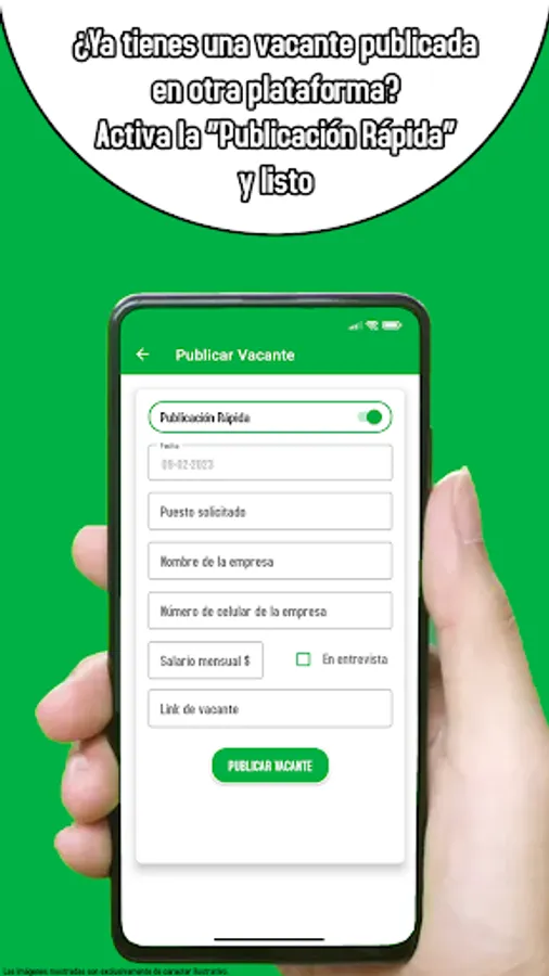 ✅ Activate the "Quick Post". If you have already published your vacancy on another platform (Facebook, Twitter, LinkedIn, etc.), just copy the link of the publication and paste it into the app in its corresponding field, fill in the 4 missing fields and that's it.