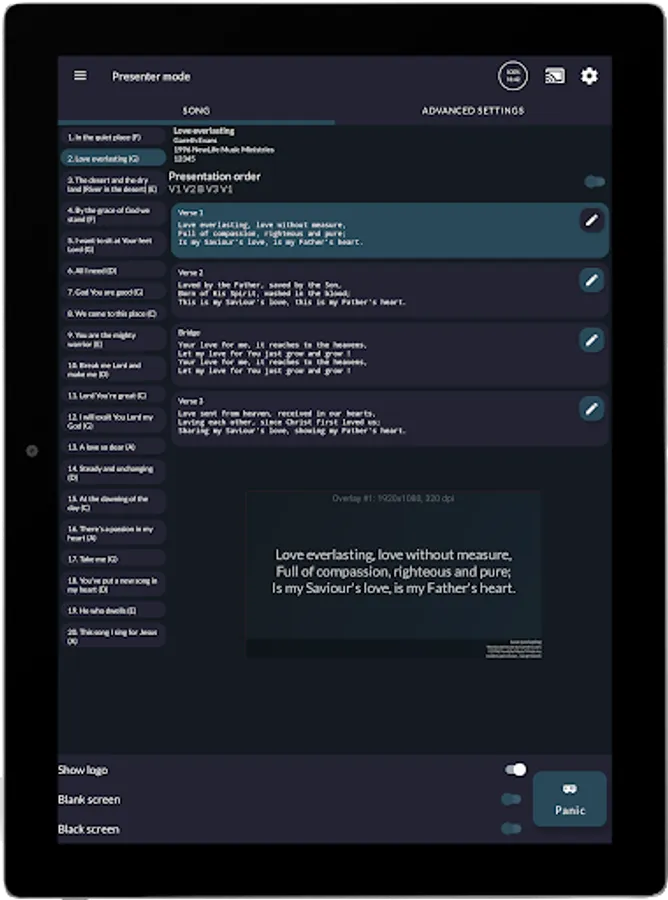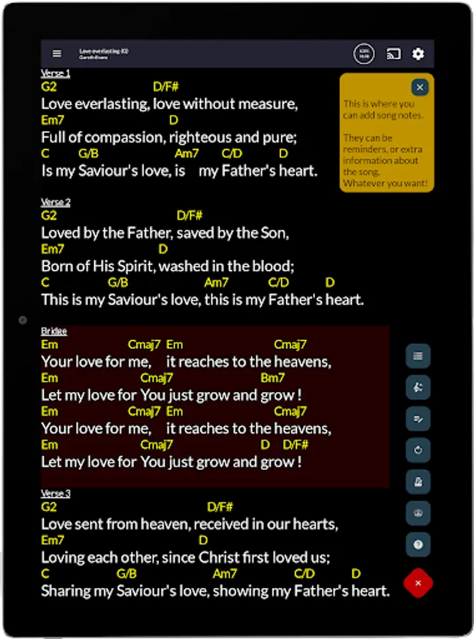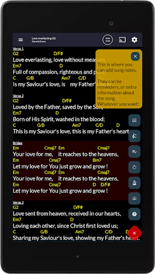 OpenSongApp is designed to compliment the Open Source application for Linux/Windows/Mac called OpenSong that allows churches to project song lyrics, Bible verses, etc. You can check them out (and support them) at: http://www.opensong.org