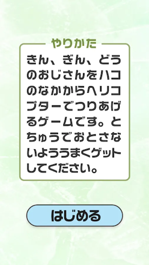 A simple game where you catch gold, silver, and copper-colored "Ojisan" with a helicopter crane!