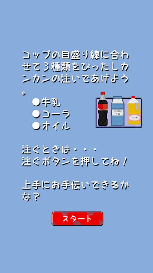 If you go over the scale line, the game will be over, so be careful when pouring the liquid!