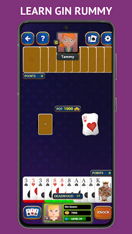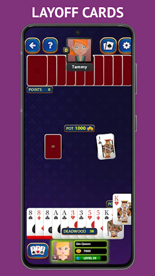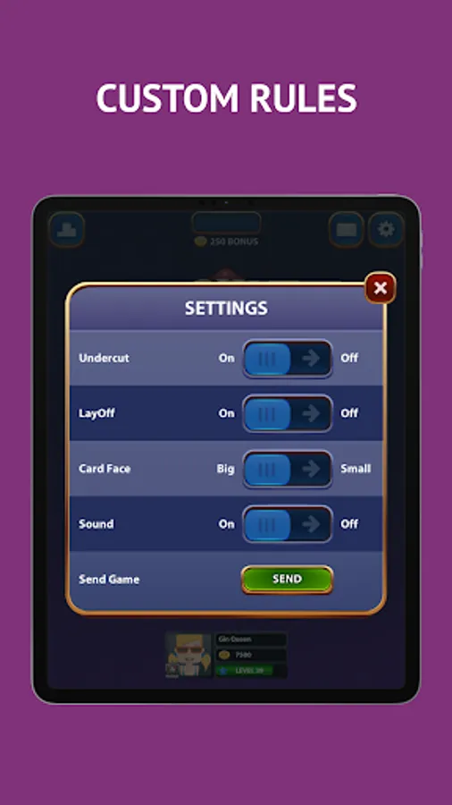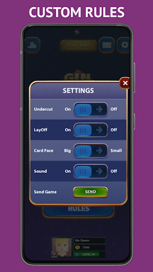 Customise the card game rules in the 'Settings' menu of the app. You can play Gin Rummy with the option of disabling the undercut bonus or preventing deadwood cards froom being matched with opponent melds