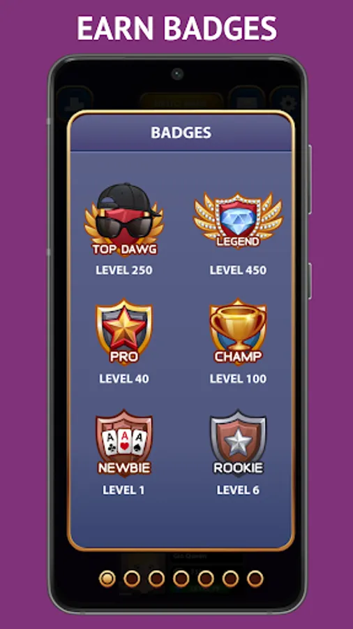 Earn achievements as your level up. 500+ levels and 6 achievement badges (Newbie, Rookie, Pro, Champ, Top Dawg and Legend) make playing Gin Rummy even more fun!