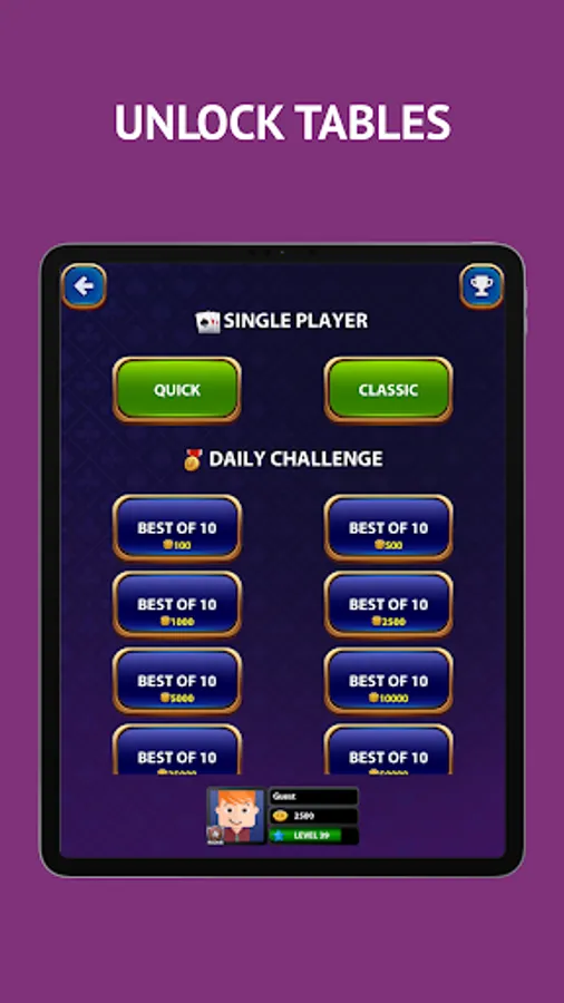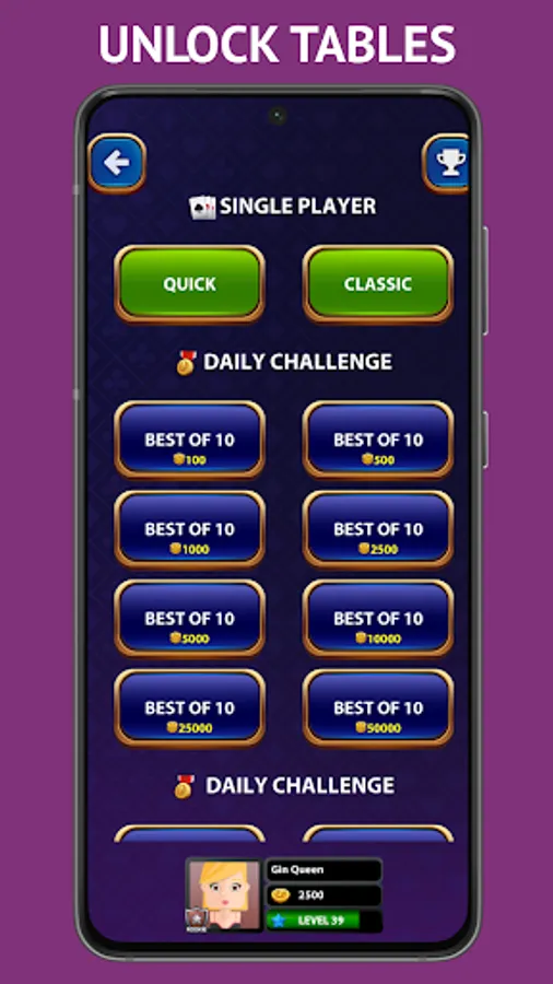 Never get bored of playing Gin Rummy with our daily challenge mode. To play, simply select a bet and play a set of games (like the best of 10). Players are ranked based on total points at the end of game series with the leaderboards refreshed daily. Playing daily challenge Gin Rummy games every day is guaranteed to make you a better player!