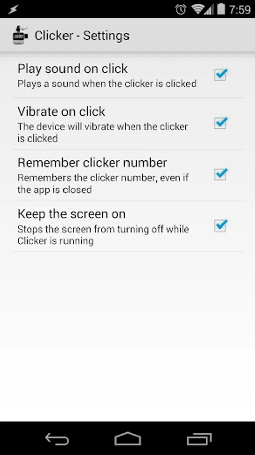 Clicker Counter makes use of Google Analytics to help with identifying what features are being used. This involves storing anonymous statistics on interactions within the application such as if widgets are being used, if certain preferences are always being disabled, and to marvel at the shear number of clicks being counted.