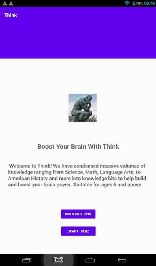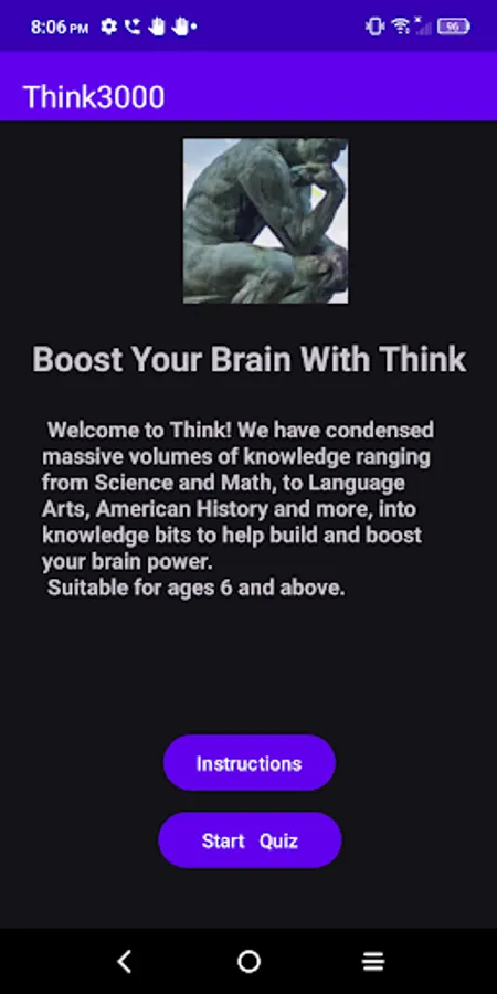 Think3000 is a learning and brain-boosting app. We have condensed a massive amount of knowledge into small bits paired with quizzes to help boost the brain and improve one's thinking ability. Subjects covered include Mathematics, Science, English Language Arts, American History, General Knowledge and more. Quizzes are presented in a fun gaming format.