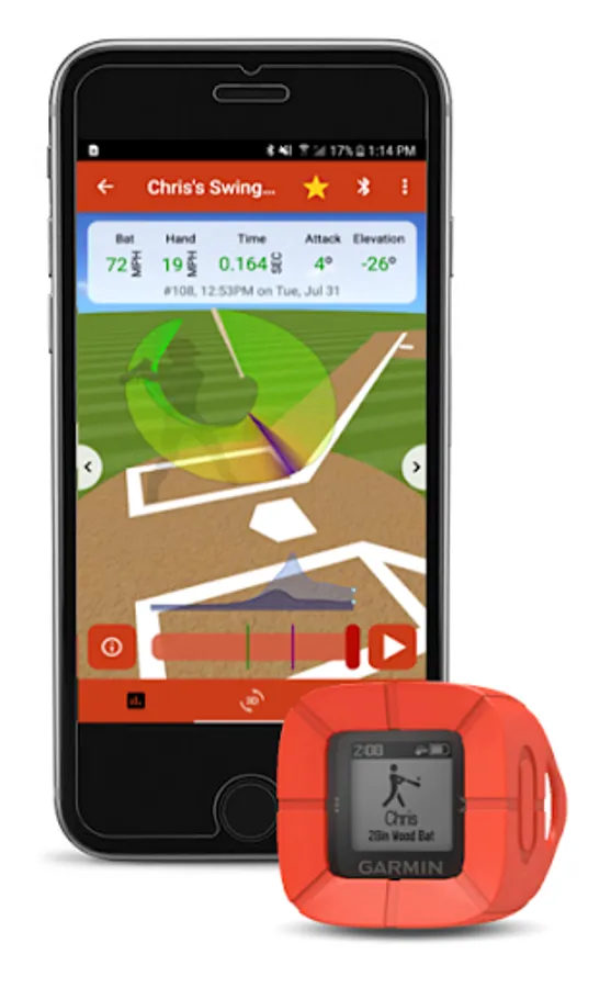 The Garmin Impact™ app interfaces with the Impact™ bat swing sensor and allows you to: