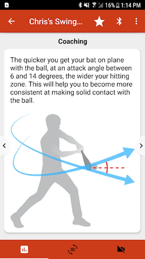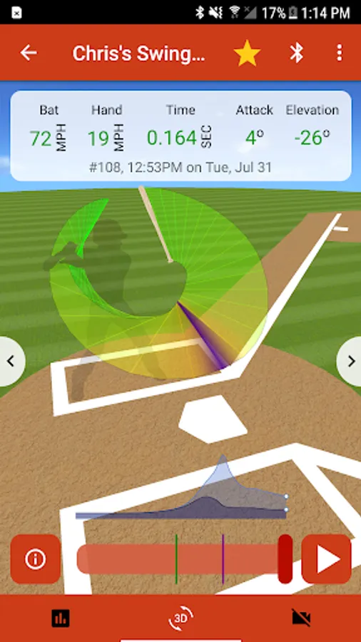 While the batter remains in position at the plate, someone outside the batting area can analyze the information provided and recommend swing adjustments. The app shows an animated 3-D graphical representation of the bat path and provides information about the bat speed throughout the swing by using green (slow) to red (fast) color coding. This allows hitters and coaches to review each swing from any angle and analyze the metrics to help improve the player’s swing.