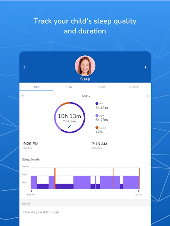 • Get detailed statistics of their child’s activity and sleep.