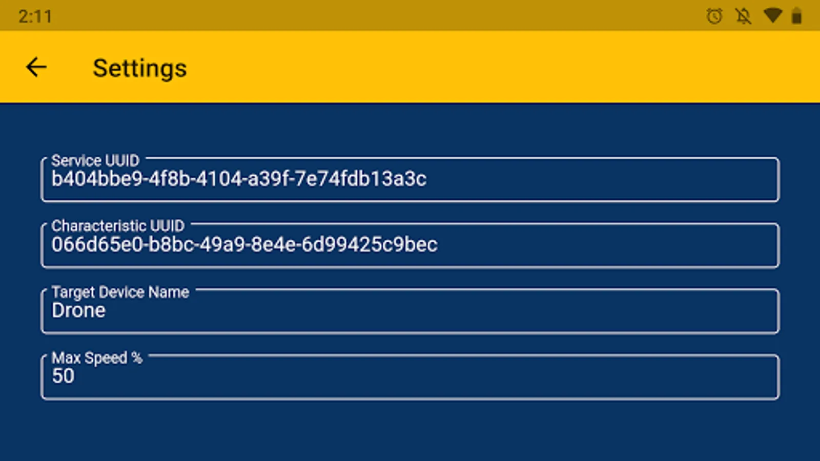 Control your drone with Bluetooth Low Energy using sent values of throttle, yaw, pitch and roll. Scan for Bluetooth devices and set the max speed.
