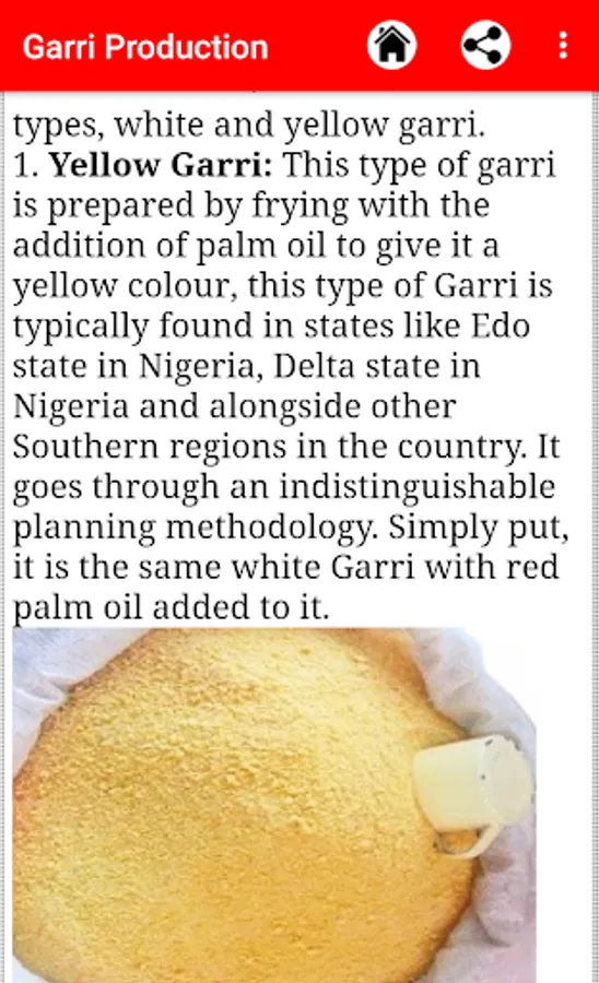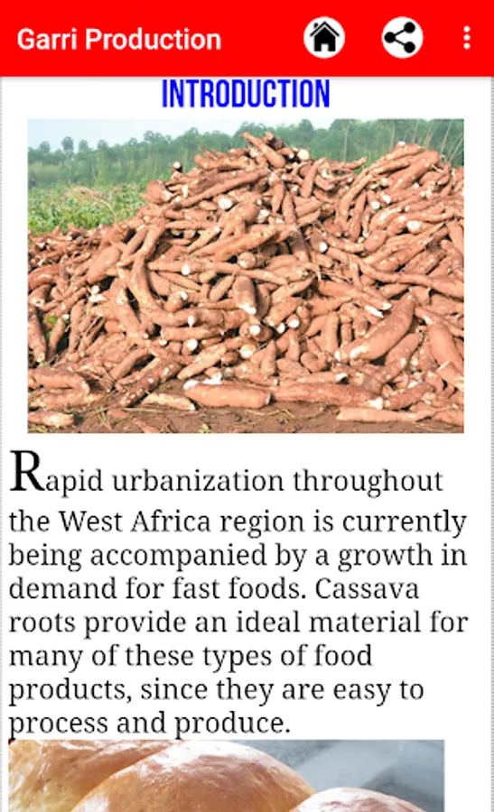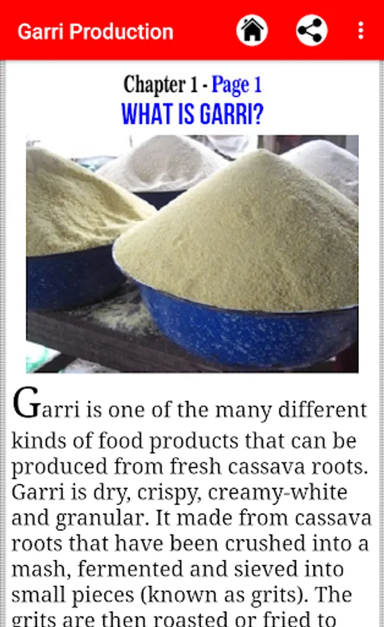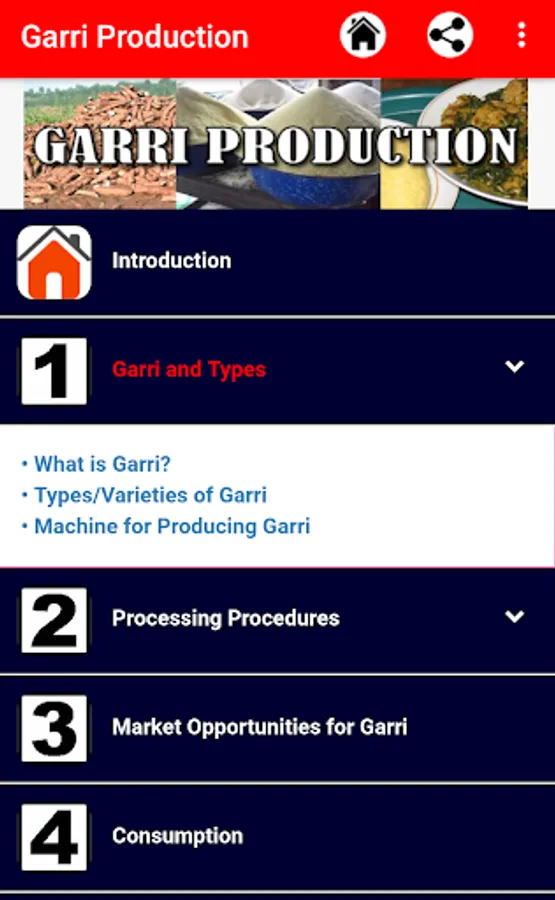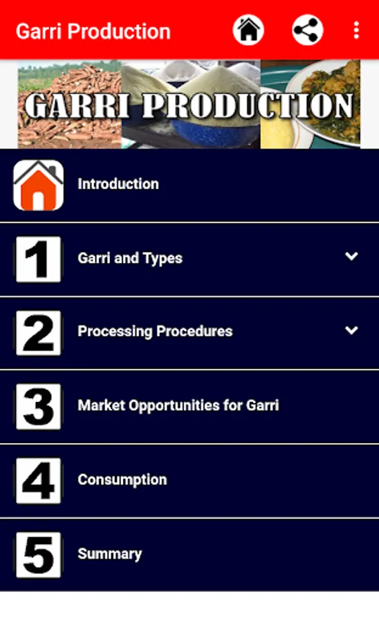 In this amazing app, we will learn to produce garri from cassava roots, below is the table of content;