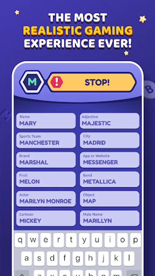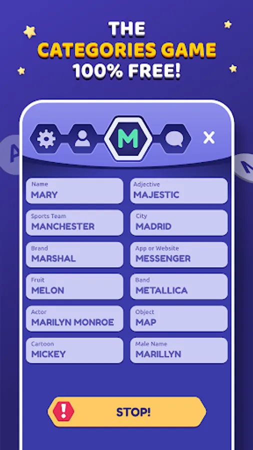 StopotS is a trendy categories game, also known as Scattergories, "City Country River" or simply Stop.