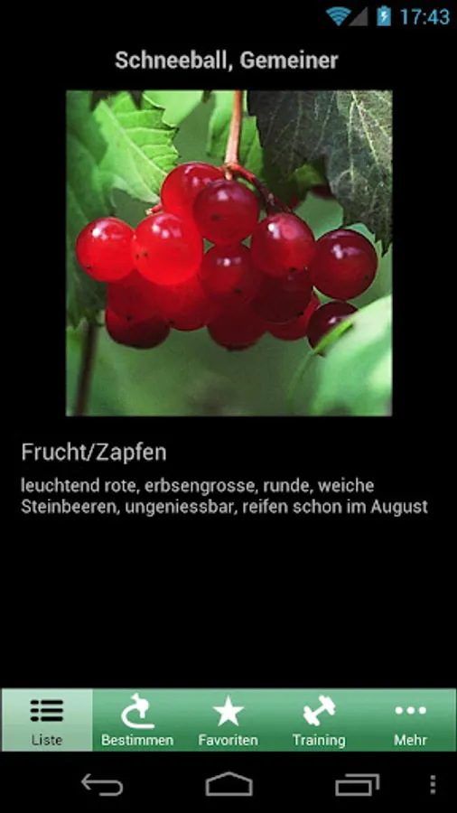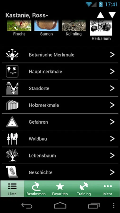 - Profile for each plant with detailed informations to botanical characteristics, wood, location, dangers, forestry, natural health, forest recipes, history etc.