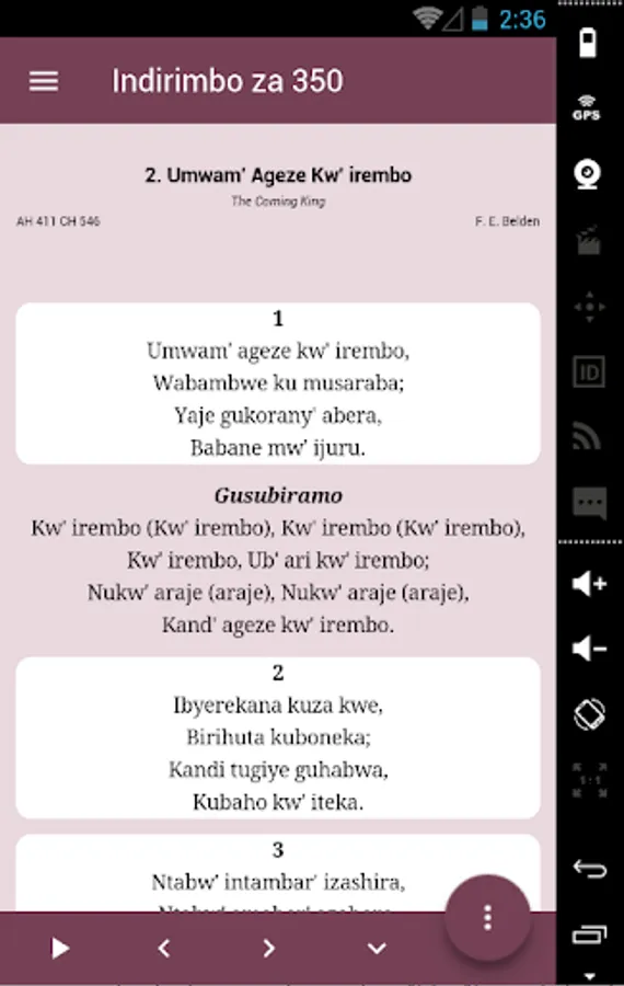 Izi ndirimbo ziri mu ndimi nyinshi kandi ziririmbwa mu turere twinshi two ku isi. Twifurije umugisha umuntu wese uharanira kuzigana umwete ngo abone uko ajya afatanya n' abavandimwe be mu Mwami Yesu guhimbaza Imana Data wa twese uri mu Ijuru.