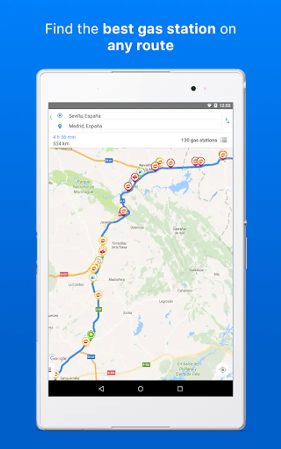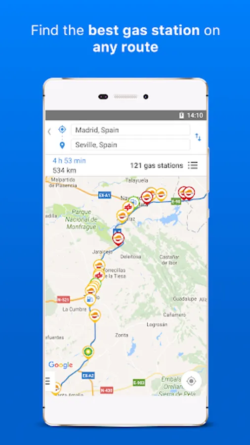 - ROUTES: select two addresses and you will get the gas stations available in the fastest route, you can choose to see the cheapest or know the distance from each of them.