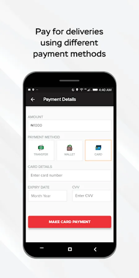 Multiple Payment Methods :- Gasby Logistics app supports multiple payment methods to allow users to pay for delivery which includes payment via Debit Cards, payment via Bank Transfer, Gasby Logistics app also supports a safe and secure walleting system which allows users to fund their wallets ahead of time while subsequent deliveries payments are deducted from their wallet.