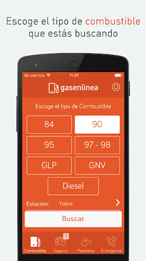 - Choose the type of fuel you want to search. In Peru chooses gasoline (84,90,95,98), diesel (DB5) or gas (CNG or LPG). In Mexico choose between Magna, Premium and Diesel