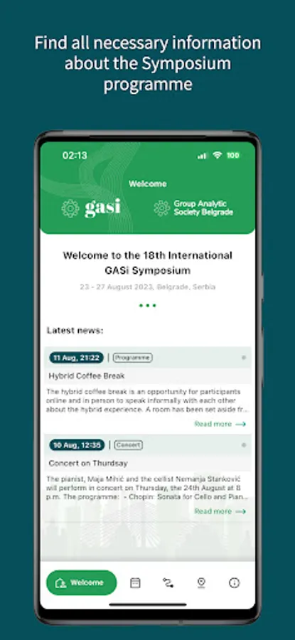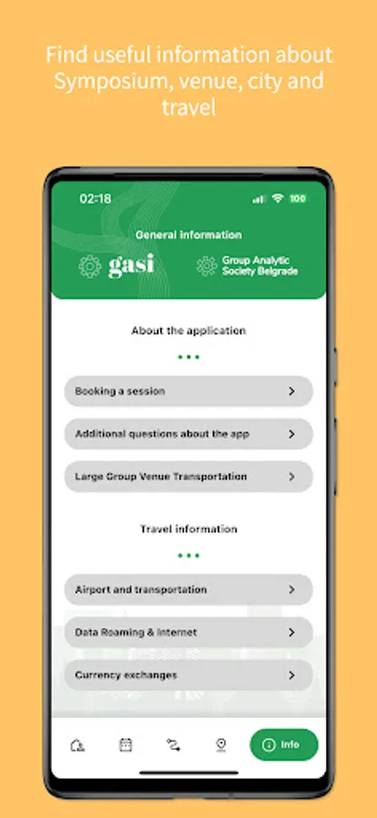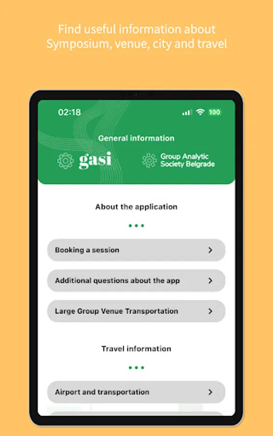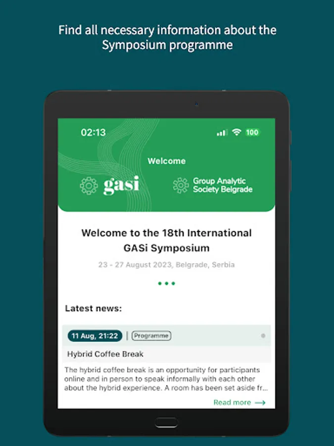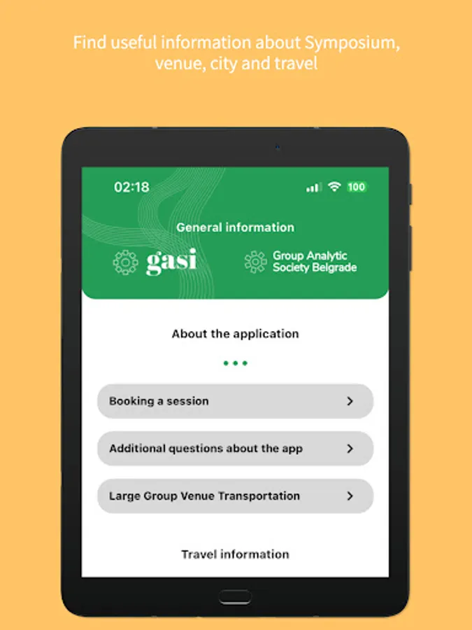 The official mobile application of the 18th International GASi Symposium Belgrade 2023. It is intended to provide attendees with most relevant information, further to replace a book of abstracts and other printing material, to provide booking functionality for the scientific programme sessions, and to facilitate attendee's navigation through the venue.